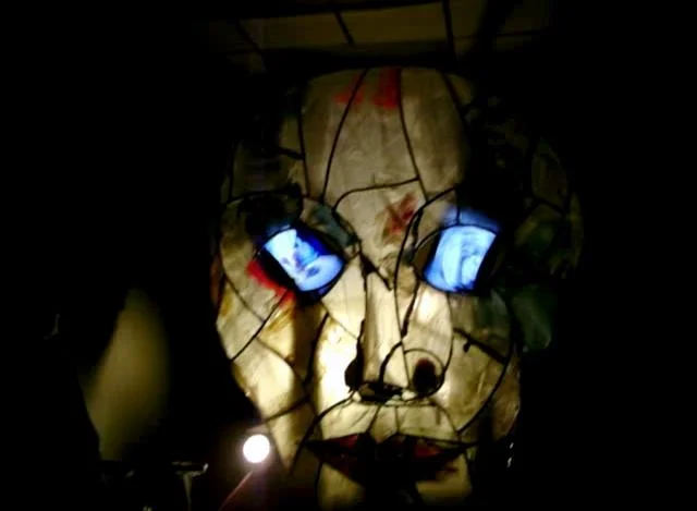 Front view of mixed media sculpture, showing video screen.
